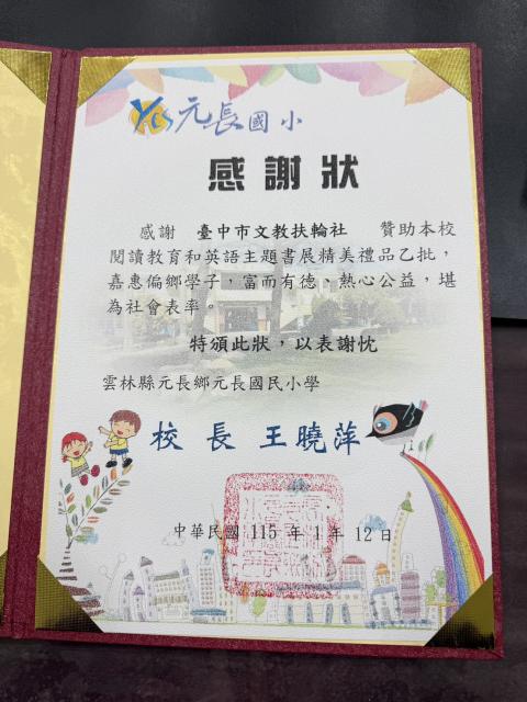 非常感謝臺中市文教扶輪社贊助本校閱讀主題書展-英語繪本學習單抽獎禮品 ,提振本校英語閱讀風氣,嘉惠學子良多,以下為校內相關活動說明 : 元長國小114上圖書館推廣活動